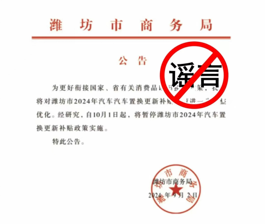 此信息为不实信息,对伪造我局公文(公章),已向公安机关报案,请广大居民不信谣,不传谣,潍坊市将严格执行国家的汽车以旧换新政策,下步汽车置换更新政策出台后,及时发布相关信息。