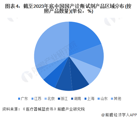 截至2023年底,中国诊断试剂国产产品数量总计8.97万件,其中广东省有1.73万件,占比为19%;江苏有1.06万件,占比为12%;北京和浙江的产品数量也均超过7000件,占比分别为9%和8%,数量远超其他区域。