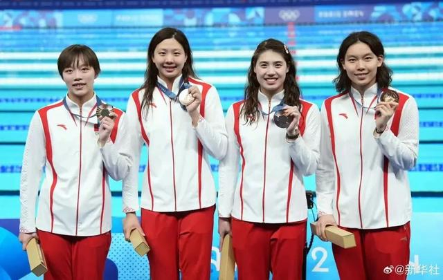唐钱婷(左二)与队友获得女子4×100米混合泳接力铜牌