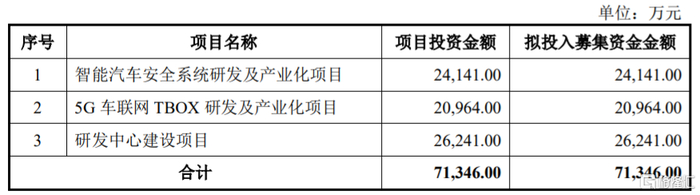 本次IPO所募集的资金主要用于智能汽车安全系统研发及产业化项目、5G车联网TBOX研发及产业化项目、研发中心建设项目。