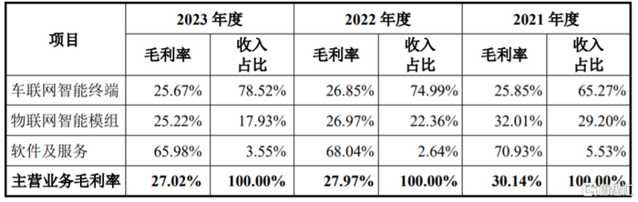 具体来看,2021年至2023年,慧翰股份超过65%的营收来自车联网智能终端业务,且该业务的营收占比呈上升趋势,同时物联网智能模组的营收占比有所下降,软件及服务营收占比较低。