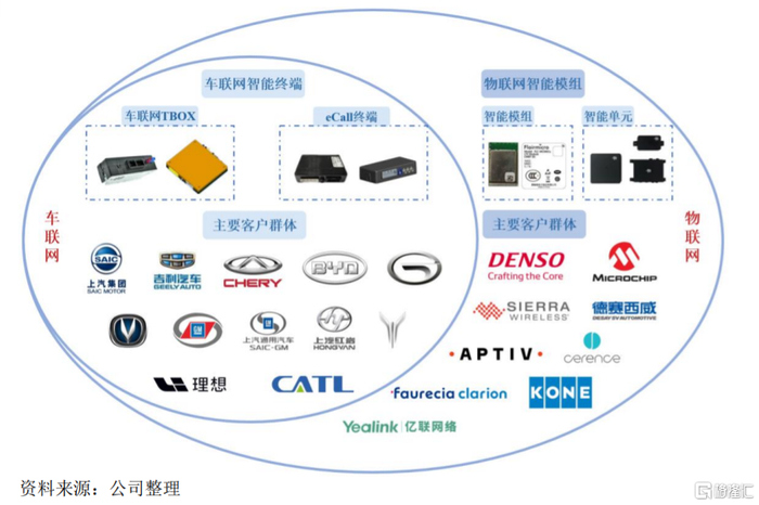 公司为上汽集团、奇瑞汽车、吉利汽车、比亚迪、长城汽车、广汽集团、理想汽车、蔚来汽车、宁德时代等多家大型自主品牌整车厂商和产业链龙头企业提供车联网智能终端、物联网智能模组和解决方案。同时,公司的智能模组还搭载在大众汽车、丰田汽车通用汽车、长城汽车等品牌车型上。