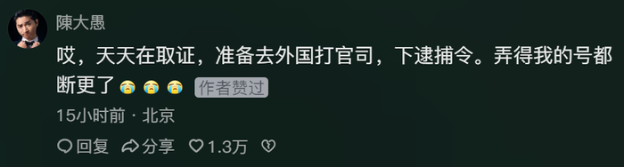 陈大愚也在评论区回复:天天在取证,准备去外国打官司,下逮捕令。