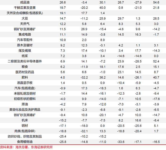 从主要产品看,1)汽车出口量价齐升,可能有基数下降因素带动,去年8月汽车出口当月同比较前值回落48个百分点。2)船舶出口同样量价双升,其中数量拉动作用更大,8月出口数量较7月上升18.9个百分点,出口金额较前值仅加快5.9个百分点。3)消费电子出口冷热不均,上月表现亮眼的“自动数据处理设备及其零部件”8月出口增速回落8.5个百分点,可能有基数抬升拖累;手机出口继续回暖,出口金额较上月加快11.9个百分点,出口数量也有提速。