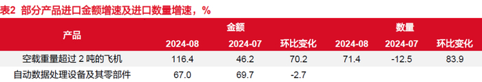 分产品大类看,8月,机电产品、高新技术产品进口增速分别回落6.6个、5.1个百分点,其中高新技术产品仍维持双位数增长,农产品进口增速由负转正。从主要产品看,8月,原油、煤、铁/铜矿砂及其精矿等多数上游资源品进口量价齐跌,其中铁/铜矿砂及其精矿进口增速回落不仅有基数走高的因素,同时也反映内需相对疲弱。汽车进口增速回落,价格拖累是主要原因;集成电路进口增速也小幅回落。飞机进口增速在基数下沉的情况下大幅加快,进口金额和进口数量较7月分别提升70.2个、83.9个百分点。