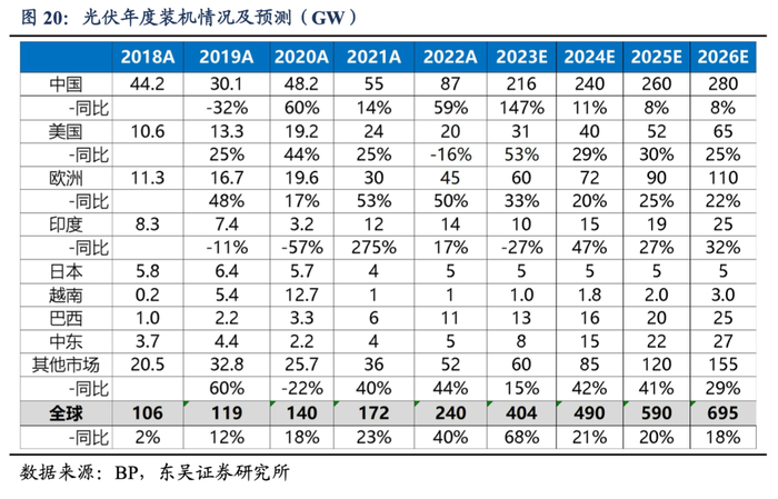 2024年中国、美国、欧洲持续增长、新兴市场爆发,海外贡献较多增量。中国2023年新增装机高基数,2024年我们预计保持平稳增长;我们预计2024年全球新增光伏装机490GW,同增21%,保持稳健增长,其中中国/美国/欧洲分别新增装机240/40/72GW,同比11%/29%/20%。