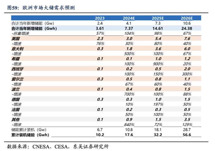 预计2024年欧洲大储装机增长104%至7.4gwh+,2025年翻番至14.6gwh:预计2024年欧洲大储装机达到7.4gwh,同比增约104%,其中英国3gwh,并且意大利开始贡献明显增量。2025年预计储能装机14.6gwh,同比增98%,英国继续高增,意大利、西班牙等放量。
