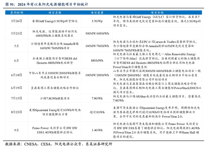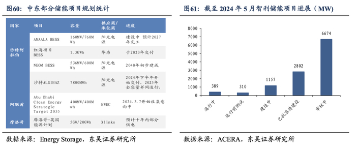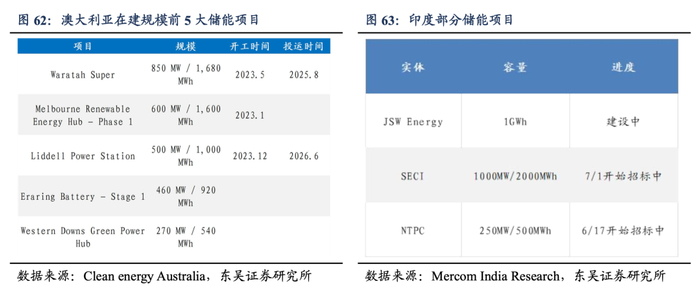 新兴市场多点开花、项目频出推动大储爆发。1)中东:加快能源转型,储能大项目密集落地,规划30gwh+;2)智利:矿山建设催生长时配储需求,规划16gwh+;3)澳大利亚:发布扩大容量投资计划,预计2030年达32GW,其中储能9GW,可再生能源23GW,2024年在建项目总容量为5 GW / 11 GWh,其中规模前五大项目合计5.7gwh,将在2025-2026年投运;4)印度:光伏装机有望高增情况下,印度加强储能项目规划,印度中央电力管理局预计到2031年至2032年储能需求为73.93GW/411.4GWh。其中约三分之二装机容量将来自电池储能系统。