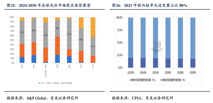 地面市场占据半壁江山,组串式渗透率提升。从市场类型看,随组件电芯降价推动光储LCOE性价比提升,地面电站市场自2023年起需求再次爆发,预计后续持续占据光伏装机需求半壁江山。从技术类型看,逆变器市场已转变为组串式逆变器为主。随技术不断进步,组串式逆变器成本迅速下降,目前已接近于集中式逆变器成本,促使组串式应用与占比不断扩大,由16年32%提升至23年的80%,组串式场景已成国内主流。