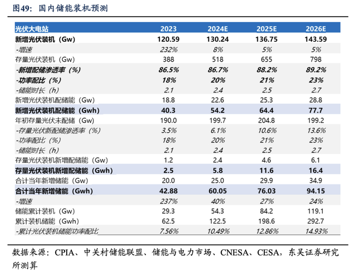我们预计24年国内大储装机增长40%至60gwh。2024年国内光伏装机120GW,同比持平,而储能功率配比提升2pct至18%,配储时长提升0.3h至2.4h,预计大储装机达到60gwh,同比增约50%,其中2024H1装机25gwh,2024H2预计35gwh。2025-2026年由于光伏装机放缓,预计储能增速下降至20-30%。