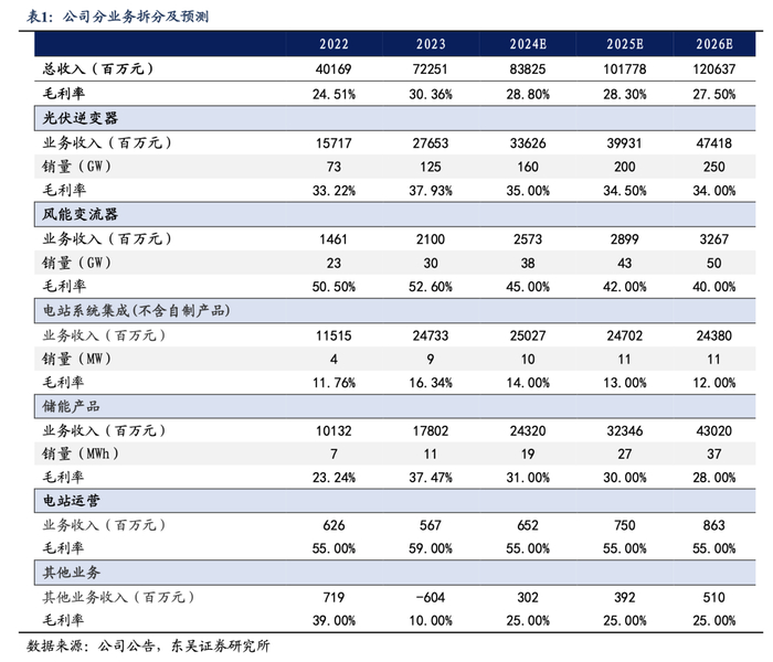 主要业务预测:考虑公司“品牌+研发+渠道”的核心优势、公司光伏逆变器以及储能系统在全球的领先地位,我们预计2024-2026年公司营业总收入分别为838.3/1017.8/1206.4亿元,收入增长主要由量增驱动,其中各主营业务收入:(1)光伏逆变器:2024-2026年出货分别为160/200/250GW,毛利率分别为35%/34.5%/34%。(2)风能变流器:2024-2026年出货分别为38/43/50GW,毛利率分别为45%/42%/40%。(3)电站集成系统(不含自制产品):2024-2026年出货分别为10/11/11MW,毛利率为14%/13%/12%。(4)储能产品:2024-2026年出货分别为19/27/37MWh,毛利率分别为31%/30%/28%。(5)电站运营:2024-2026年收入分别为652/750/863百万元,毛利率分别为55%/55%/55%。(6)其他业务:2024-2026年收入分别为302/392/510百万元,毛利率分别为25%/25%/25%。