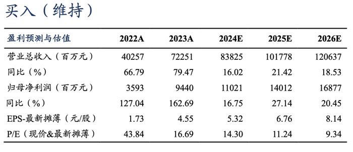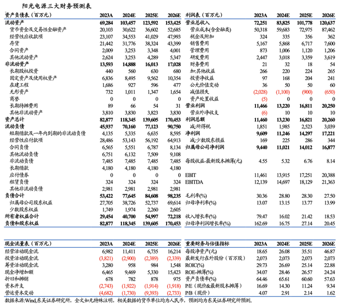 预计公司出货持续增长、盈利保持坚挺。公司将着力提升产品竞争力,扩大全球营销网点和服务网点的布局,叠加光伏需求持续增长,我们预计公司出货量将实现快速增长,2024年有望达160-170GW出货,同增30%+;后续保持稳健增长。