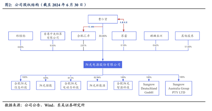 股权集中度高,股权结构稳定。截止2024年6月30日,创始人兼董事长曹仁贤为公司实际控制人,直接持股30.46%,通过合肥汇卓股权投资合伙公司间接持股0.29%,其配偶苏蕾持股0.18%,曹仁贤合计持股30.93%,公司股权集中度高。公司重要子公司有阳光储能、合肥阳光电动力科技、阳光新能源、阳光氢能等,分别布局储能、电机、电站投资开发、氢能等多项新能源领域业务。