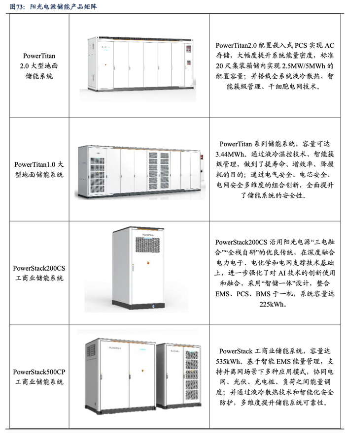 公司深耕储能多年,产品矩阵布局全面。阳光电源自2006年开始涉足储能业务,并进行PCS的研发,2014年阳光电源明确致力于成为全球领先的储能产品及系统解决方案供应商,目前阳光电源已经成为全球一流的储能系统解决方案供应商,依托全球领先的电力电子、电化学、电网支撑“三电融合”技术,打造专业储能系统,提供户用、工商业、地面等全场景储能系统应用,产品布局全面。