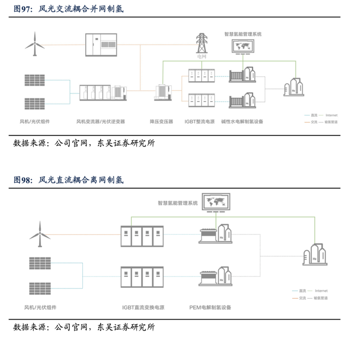 率先发布柔性制氢,对未来风光大规模制氢发展有重要意义。阳光氢能在国内率先提出柔性制氢概念,发布了柔性制氢系统解决方案,且基于柔性组网、电力电子、能量管理等六大核心技术,聚焦PWM制氢电源、电解水制氢设备、智慧氢能管理系统三大核心设备,构建了灵活、高效、友好的可再生能源柔性制氢系统。该系统能够充分适应新能源功率快速波动和间歇特性,实现“荷随源动”,对电网更加友好,在30%的功率下稳定运行。阳光氢能柔性制氢系统已在国内多个大型示范项目中应用,其“一键启停”、“集群控制”等卓越性能,得到用户的高度评价。