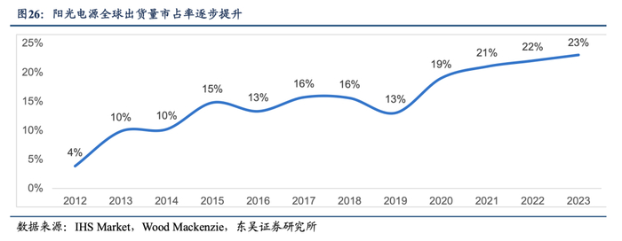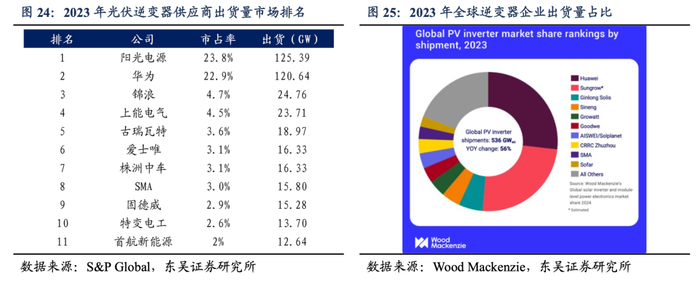 行业集中度提升,阳光电源、华为头部地位稳固。光伏逆变器因其技术壁垒较高,在发展初期一直被国外逆变器企业所垄断。我国的逆变器企业在不断研发过程中逐步突破技术障碍,目前已在全球逆变器行业中占据一定地位。2019年,由于美国政府贸易制裁,华为撤出美国市场,公司快速占据美国市场,因此2020年市占率增长较高。同时随着中国市场装机占比提升,公司凭借地面光伏产品优势,市占率持续提升。根据S&P Global,2023年光伏逆变器供应商中阳光电源出货量位列第一;根据IHS,公司2023年全球出货量市占率提升至23%。