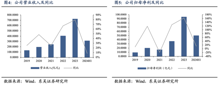 公司历年营收和净利润保持稳增长。2023年公司实现营收722.5亿元,同增79.5%;由于海外需求上升、原材料降价、规模效应、运费下降及汇兑收益等,2023年公司实现归母净利润94.4亿元,同比增长162.7%,实现超高速增长。2024H1营收310.2亿元,同增8.4%,归母净利润49.6亿元,同环增13.9%;其中24Q2营收184.1亿元,同环比增14.7%/45.9%,归母净利润28.6亿元,同环比增0.6%/36.6%,业绩略超预期。