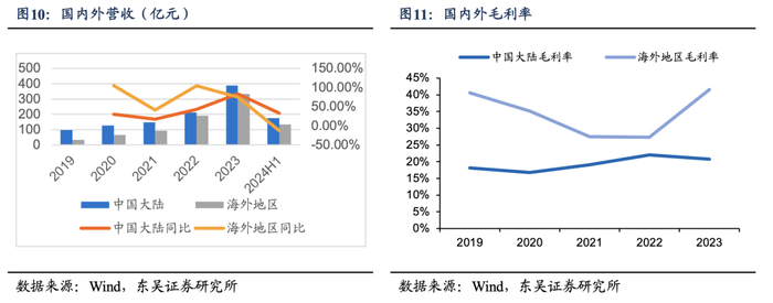 公司全球化布局不断深入,充分受益于海外市场高毛利。分地区来看,2023年公司实现国内营收388.81亿,同比增长83.45%,毛利率为20.73%,同比下降1.31pct,海外地区营收333.69亿元,同比增长75.05%,毛利率为41.57%,同比上升14.24pct。海外市场产品毛利率显著高于国内市场,公司长期布局美国、欧洲、澳大利亚、中东等市场,2023年海外毛利额占比达到63% 。