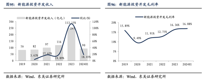 2023年,公司新能源投资业务实现营业收入247亿元,同比增长102%,为公司第二大业务,主要得益于公司加速向分布式户用业务转型,家庭光伏开发年装机量增长200%,且随着上游原材料降价,毛利率提升至16.36%,同比增加4.6pct。预计2024年随着组件价格回落至正常水平,地面项目经济性回升,各项目装机将进一步增加。