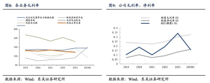 盈利能力看,光伏逆变器、新能源投资开发毛利率较为稳定,储能系统、光伏电站发电具有一定波动性,公司近年销售毛利率、净利率总体呈现上升趋势。