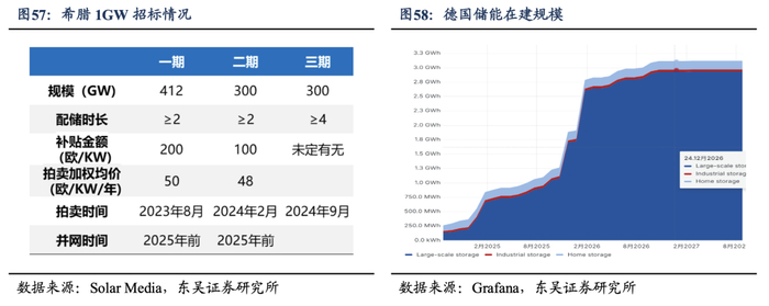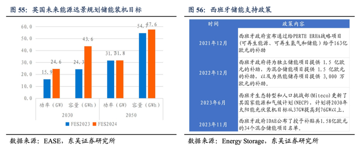 1)欧洲:可再生能源消纳催生大储需求,24-25年高增新能源消纳催生储能支持政策,预计2024年大储起量。1)英国:24年未来能源愿景规划上调2030年储能装机至24.6GW/43.6GWh,较23年版本提高55%/79%;24-26年高增可期。2)意大利:公布177亿欧元的储能计划,以援助该国建设超过9GW/71GWh的储能设施,政策加码推动24年大储井喷。3)西班牙:2023年计划将2030年光伏装机目标从37GW提升至76GW,从而拉动储能需求。西班牙大储已获得并网许可的有6.5GW,还有5GW的新并网申请正在处理中,储能规划项目超10GW,2024-2026年持续高增。4)希腊:设定2030年储能装机目标,储能目标为3.1GW,峰值需求为10GW,2023年7月希腊1GW独储项目招标,另外目标在建2GW,25-26年持续高增;5)爱尔兰:2023年末储能累计并网0.7gwh。2024Q2末在建项目2.2Gwh,已获批准5.3GWh,已提交申请3.7GWh,预申请0.45GWh; 6)波兰:2024年6月Pacific Green已同意收购波兰两个均为50MW/200MWh的储能项目,计划参与24年容量招标,另外7月波兰电力生产商PGE集团宣布建造900MWh储能设施的招标。预计2025年起波兰大储并网放量,有望达到0.4GW,2026年翻番;7)德国:大储装机规模仍较小,2025年开始爆发。2023年大储装机0.3gwh,同比-36%,24年前7月装机0.14gwh,同比-3%,预计全年持平;截至2024年7月,德国大储在建2.9gwh,其中2025年拟并网2gwh,保守预计2025年大储有望翻番增长至0.7gwh,2026年维持50%+增长。