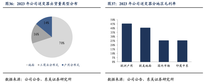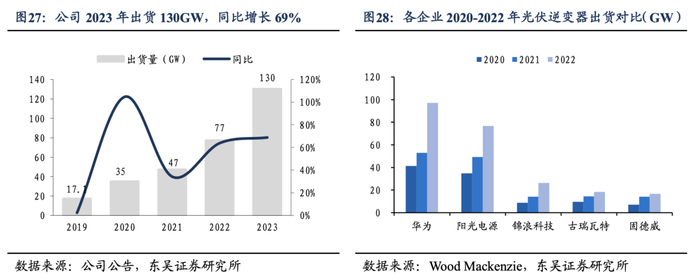 逆变器出货持续走高,龙头地位稳固。在全球碳中和战略、欧洲能源危机和公司品牌竞争力稳定提升的驱动下,2023年公司逆变器出货量达130GW,同比增长69%,2019-2023年CAGR达51%。公司持续加强研发创新,深耕重点细分市场,充分发挥全球营销、服务及供应链优势,全球竞争力及影响力持续提升,行业龙头地位稳固。