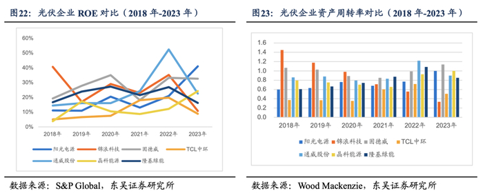 逆变器赛道好,轻资产高ROE高周转:横向对比逆变器行业(阳光电源、锦浪科技、固德威)、硅片行业(TCL中环)、硅料行业(通威股份)、组件行业(隆基绿能、晶科能源),逆变器行业商业模式轻资产高周转,ROE、资产周转更高,为商业模式更好的优质赛道。
