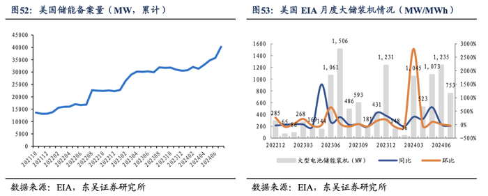储能备案量重回增长,大储装机持续爆发。受益于并网流程优化,2024年储能备案量重新起势,根据EIA数据,截至2024年6月,美国大储储备项目35.77GW,较2023年底增加17%,其中拟2024H2并网规模10.8GW(同比2023H2实际并网增145%),拟2025H1并网规模6.3GW(较2024H1实际并网增55%),为美国未来大储高增奠定基础。2024H1美国大储装机4.1GW,同增126%,容量装机11.2GWh,同比增201%,美国大储装机需求爆发增长。