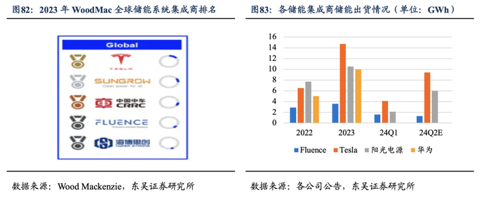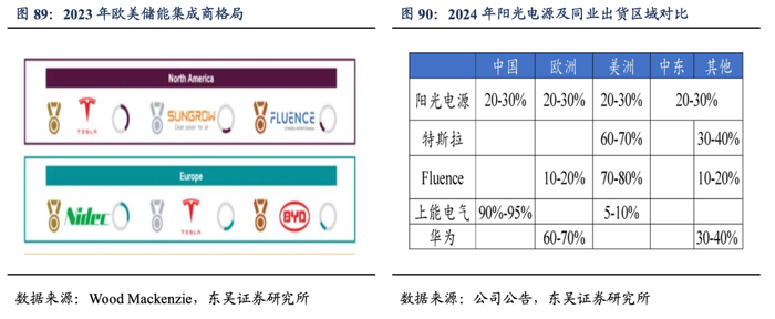 出货区域各有千秋,阳光电源美国市场表现优异。从出货区域角度看,特斯拉、Fluence均为美国本土强势品牌,美国出货占比为各自公司大头,阳光电源是为数不多做进美国市场国产大储厂商且位居前列,2023年公司储能业务中美洲出货占比40%,美国市场品牌力优异,2023年在美国市场排名第二,较2022年又提升一名;华为主要以欧洲户储为主,目前逐步加大工商储与大储发展;比亚迪欧洲市场布局深厚,品牌较为知名,2023年在欧洲储能集成商中排名第三;上能电气主要以国内市场为主,逐步加大美国市场开拓。