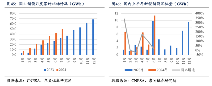 强制配储政策下国内大储需求持续高增。2022年以来各地政府陆续出台光伏等新能源发电的配储要求,2024年以来,部分省市对于强制配储比例要求进一步提高,强制配储政策下驱动储能需求持续高增。截至2024H1,国内储能装机超30GWh,同增60%+;截至2024年7月,国内储能累计招标达50GWh,同增50%+,储能招标持续保持高增长态势,为国内储能需求高增奠定基础。