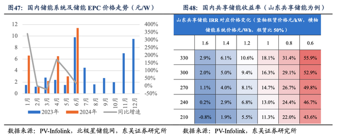 成本下行下推动储能IRR提升,储能实际利用率逐步提升。2023年以来,储能价格不断下滑,截至2024年6月,EPC价格达到1.0元/W,储能系统价格达到0.6元/W。储能建设成本的下调推动储能IRR提升,以山东市场为例,我们测算30%/2h的光储系统IRR自2023年底的8.8%提升至当前的12%,同时2024年储能实际利用率逐步提升,国家能源局显示2024H1国网区域的储能利用小时数达390h,同比翻倍增长,储能实际利用率逐步提升。