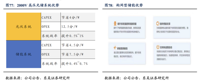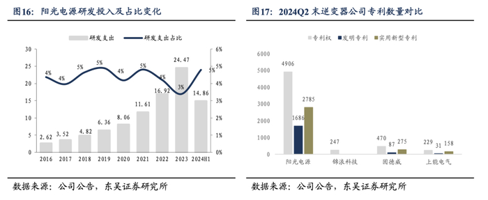 多项技术领先,电池能源管理更为优异,助力未来高成长。公司持续加强研发支出,除干细胞电网技术外,亦推出:1)2000V高压光储系统:可提高系统电压、可实现成本进一步摊薄,同时提升系统效率,实现降本提效。2)同时基于干细胞电网技术在储能领域推出构网型储能,相较于传统跟网型储能,可以内部设定电压参数,输出稳定的电压与频率,同时构网型储能系统不仅可以并网运行,还可以离网运行,对电网的支撑能力较强。由于其电压源的特性,构网型储能系统能够有效改善新型电力系统的短路容量和转动惯量缺失等问题。2024年6月阳光电源储能变流器一次性通过中国质量认证中心(以下简称“CQC”)的全球首个构网技术标准认证。3)三电融合,公司电池能源管理更为优异:将储能涉及的电化学、电力电子、电网支撑三大核心技术从底层研发逻辑上打通、融合,让电池管理系统(BMS)、储能变流器(PCS)、能量管理系统(EMS)实现高度协调和配合,基于对三电融合的理解,阳光电源还在PowerTitan2.0中革命性首创“交直流一体”设计,将电池单元与PCS融于一柜,改变了传统三段式储能结构,让储能系统的效率、性能、安全、智慧水平均得到颠覆性提升,公司在电池能源管理上更为优异。