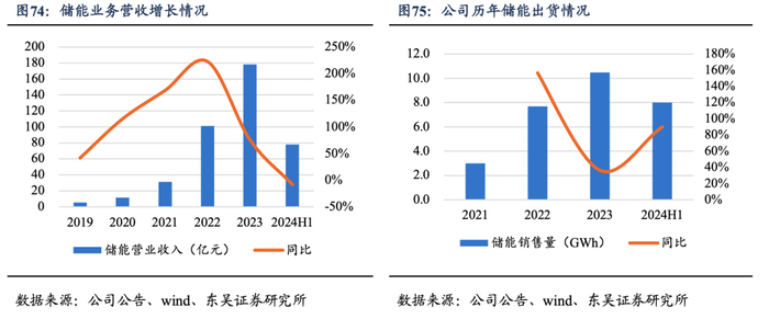 受益储能需求爆发,公司储能出货持续高增。2022年开始受益于全球户储及大储需求爆发,公司储能系统出货持续高增,2023年公司储能业务实现营收178亿元,同增76%,实现储能出货10.5GWh,同增36%,2024年随大储需求持续旺盛,公司出货持续高增,2024H1出货约8gwh,但受储能系统价格下滑影响,营收增速略有放缓。
