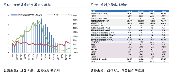 库存消化接近尾声,24年需求有所回落,25年有望重回增长。欧洲市场户储库存仍在消化阶段,预计2024Q4消化完毕,但出货层面看,需求逐步恢复增长,我国出口欧洲的逆变器数据从2024年3月起开始逐月环增,2025年随库存全部消化有望恢复正常增长。2024年我们预计户储装机10.26GWh,同降15%,2025年需求有望达12.36GWh,同增20%。