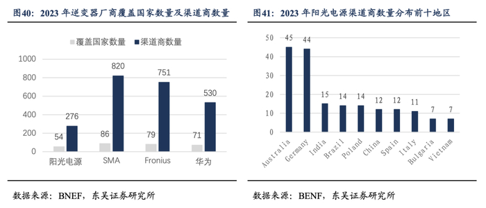 中美欧等多地市场渠道建设加速,品牌辐射广。截至 2023 年底,公司已在海外建 设超 20 家分子公司,全球五大服务区域,85+全球服务中心,拥有 276 家渠道合作伙伴, 覆盖超 54 个国家和地区。其中,澳大利亚渠道商 45 个,为渠道商数量最多的国家;德 国 44 个,为欧洲市场渠道商最多的国家,公司渠道建设行业领先。