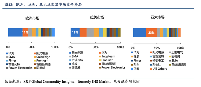 得益于品牌效应与产品创新,公司全球市场龙头地位稳固。根据IHS数据,公司在欧洲、拉美、亚太市场份额分别为11%、18%、23%,海外份额优异,支撑逆变器盈利能力。