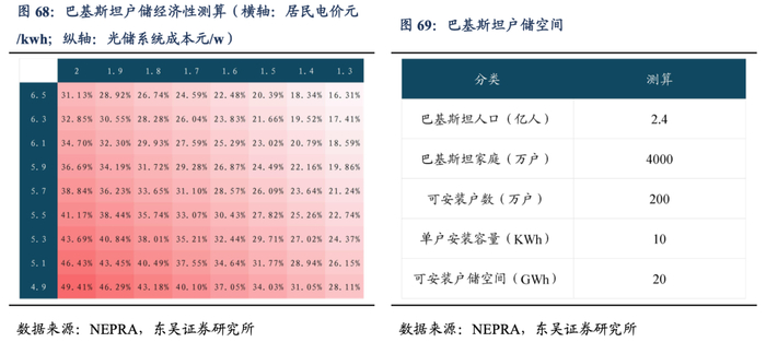 巴基斯坦电价高企,政策+经济性驱动户储需求爆发。政府债务危机严重,为满足IMF贷款条件,持续上涨电价提高财政收入,当前居民电价约1.8元/KWh,用电成本高昂,同时屋顶光伏计费制度转为总计量政策,进一步推动户储需求增长,测算巴基斯坦户储IRR为39%+,3年左右时间即可回本,同时我们测算巴基斯坦户储需求空间达20gwh,需求空间广阔。