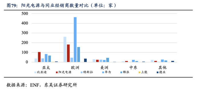 公司全球化布局深厚,渠道建设处行业前列。公司持续加强全球化布局建设,公司在亚太、欧洲、美洲、中东、非洲均有完善的经销商与安装商渠道资源,且经销商的数量处于行业领先地位,根据ENF数据显示,截至2024年7月,阳光电源全球经销商数量为336家,经销商处于行业前列,低于华为与比亚迪,主要系华为在户用市场更加强势,户用市场更依赖经销商,比亚迪主要在欧洲市场优势显著,经销商布局较多。