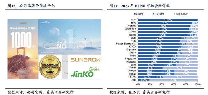 品牌力优异,BNEF可融资性评级全球第二。根据BNEF调查统计,2023年储能集成商企业可融资性排名中,阳光电源排名全球第二,较2022年第三再次有所提升,在全球储能厂商中仅次于Fluence,高于比亚迪、特斯拉、宁德等厂商;在储能PCS可融资性评级中公司同样位列第二,公司全球品牌力优异。