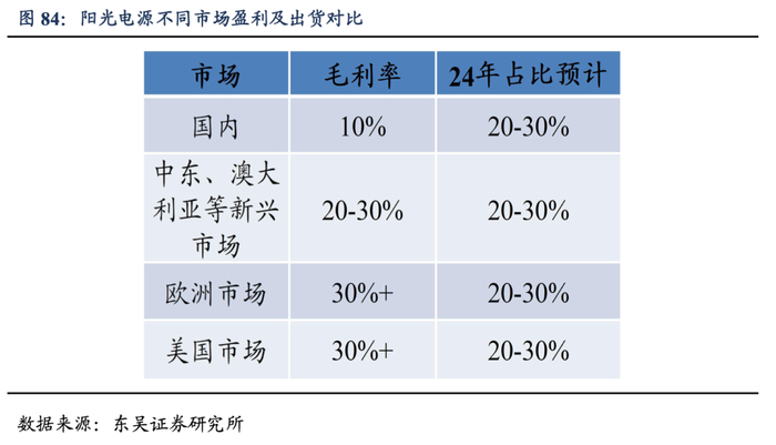 品牌渠道积累深厚、外销占比持续提升。BNEF发布的《逆变器融资价值报告》显示,阳光电源已成为全球最具融资价值的逆变器品牌,光伏电站采用阳光电源逆变器更容易获得银行融资和无追索权贷款。2023年公司海外地区实现营收333.69亿元,同比增长75%,占比46.2%。