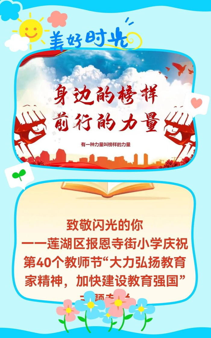阳光讯(记者 刘杰)9月10日,闪光的日子。在这个特别而又温馨的日子里,大家迎来了第40个教师节。为弘扬新时代尊师重教风尚,激励全体教师坚守教育的初心与使命,提振新时代教师团结奋进的新士气,西安市莲湖区报恩寺街小学举行了教师节系列庆祝活动,向全体教师表达关爱、抒写致敬、礼献祝福。