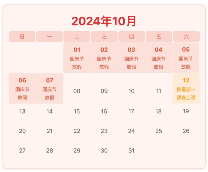 2024年9月14日(星期六)按星期一课表上课;2024年10月12日(星期六)按星期一课表上课。
