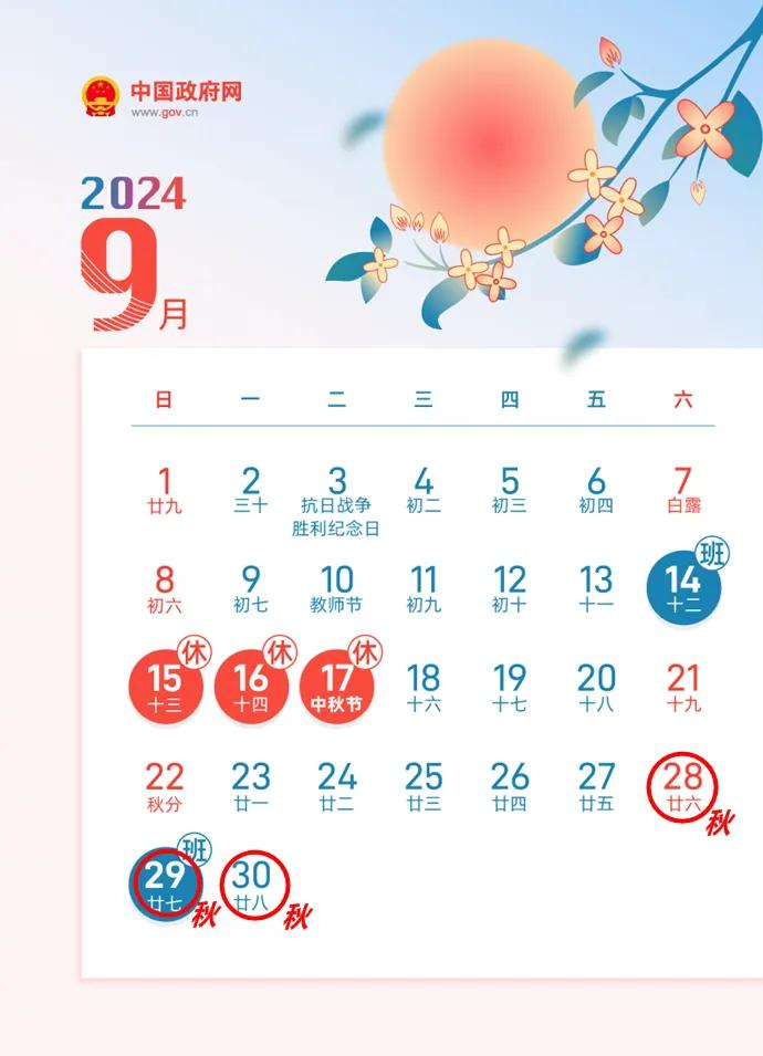 9月15日(星期日)至17日(星期二)中秋节放假调休,共3天。9月28日(星期六)至10月7日(星期一)秋假、国庆节放假调休,共10天。