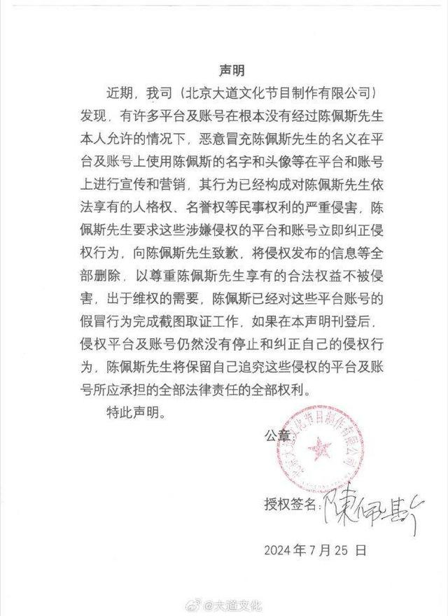 今年7月26日,陈佩斯父子的公司大道文化发表声明,声明表示恶意冒充陈佩斯的行为已构成对陈佩斯人格权、名誉权和民事权利的严重侵害,陈佩斯要求这些涉嫌侵权的平台和账号立即停止侵权行为并致歉,删除全部侵权信息。陈佩斯已对平台账号的假冒行为完成截图取证工作,大道文化同时公开了陈佩斯的官方平台账号以正视听。然而,“假陈佩斯”依旧没有收手,反而变本加厉。8月初,陈大愚向海外相关平台发送邮件要求处理侵权账号,并报警处理此事,但因是境外网站,处理难度很大。8月11日陈大愚联系到一位在海外的律师协助处理此事,在8月16日以合法合理的手段要求平台封禁了冒名顶替的账号,下架了违规视频。