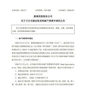 近日,嘉寓控股股份公司(证券代码:300117,证券简称:*ST嘉寓)发布关于子公司被法院受理破产清算申请的公告,其全资子公司四川嘉寓门窗幕墙有限公司(以下简称“四川嘉寓”)的破产清算申请已被四川省什邡市人民法院正式受理。
