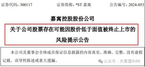 事实上,嘉寓股份自身早已危机重重,在今年4月25日,嘉寓股份发布公告称,公司股票交易自2024年4月29日起被实施“退市风险警示”和“其他风险警示”,股票简称由“嘉寓股份”变更为“*ST 嘉寓”。