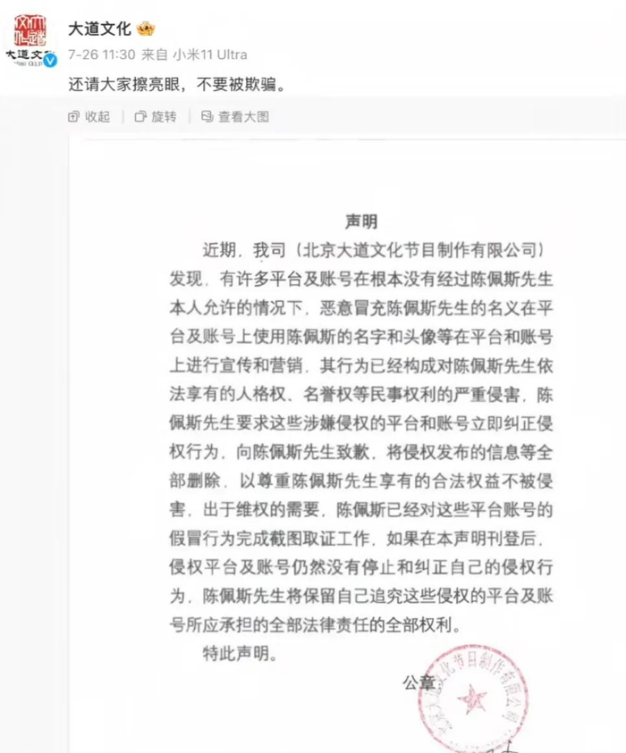 大道文化也发布了相关声明