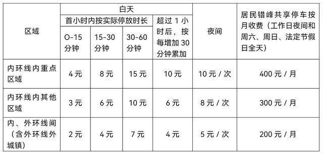 注:有关白天和夜间的具体时段以道路停车收费标志牌公示的时段信息为准;超过1小时后,按每增加30分钟作为一个累进计费单位,每增加不足30分钟的,按照30分钟计费。