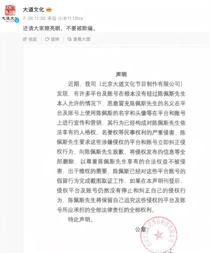 陈佩斯的大道文化也发布了相关声明,提醒大家擦亮眼,不要被欺骗,并警告冒充者将受到法律制裁。