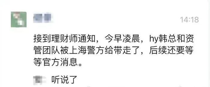 而在此前,就有消息称,有援引海银员工消息证实,海银财富老板韩宏伟及高管20多人被警方带走审查。关于带走时间,海银员工说法不一,有说(9月10日)早晨被带走,也有说昨日晚间被带走。